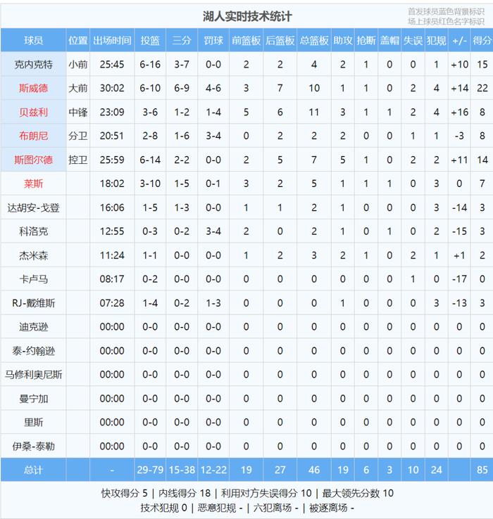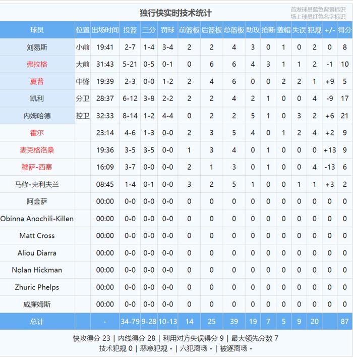 全场结束,独行侠87-85险胜湖人。弗拉格跟布朗尼都是高开低走:弗拉格投篮21中5,三分5中0,罚球1中0,拿到10分6篮板4助攻3抢断,其中下半场6中0怒砍0分。布朗尼投篮8中2,三分6中1,罚球4中3,拿到8分2篮板2助攻。